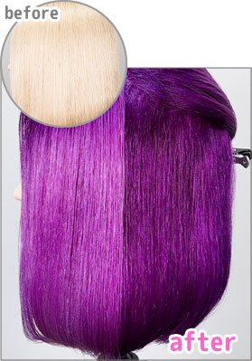 複数回ブリーチで白に近くまで明るくしたベース毛に『ショッキングパープル』原液を使用すると、クリームの見た目通りの濃いムラサキになります!