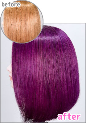 以下で「白に近い白金毛」・「黄色味のある明るい金髪」・「オレンジ味の強い金髪」・「明るめの茶髪」の4パターンのベース毛別に、『ショッキングパープル』の発色をご紹介します!