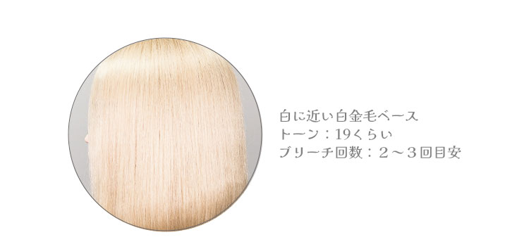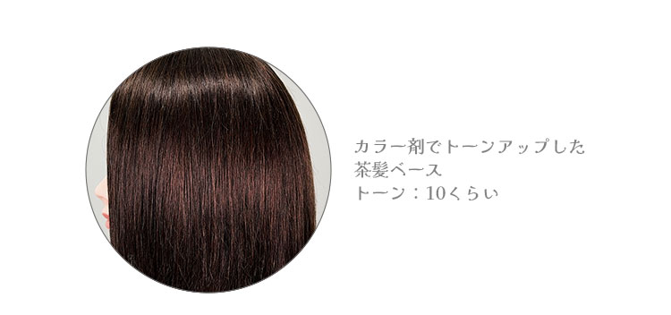 白金毛や黄色味がある金髪ベースに使用した場合と比べ、透明感は出にくく、やや沈んだ発色になります!