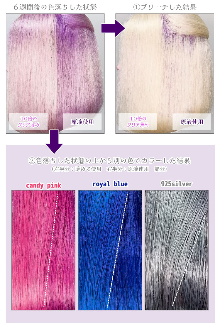 10倍の『クリアクリーム』で薄めて使用した方は1週間程でパステルパープルになりましたが、薄まった状態がしばらく続き、薄いピンク味のある色に退色していきました!