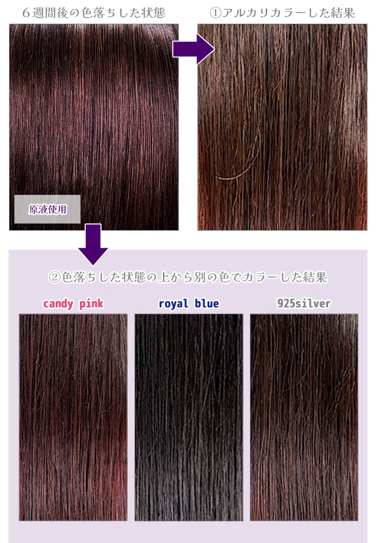 「2.ショッキングパープルの退色」でご紹介している6週間後の状態が、基本的な“カラーチェンジのタイミング”になるかと思います!