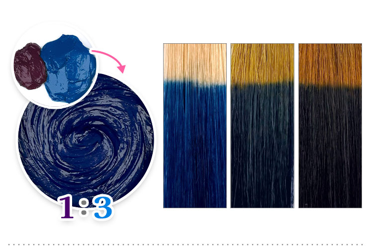 濃く発色が強いカラーなので、黄色味のあるワンブリーチレベルの金髪毛でもしっかりと発色します◎